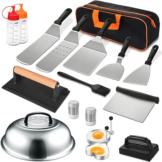 Chef's Choice: Deze set bevat professionele gereedschappen zoals spatels, schrapers, en olieflessen die Amerikaanse BBQ restaurants ook gebruiken.