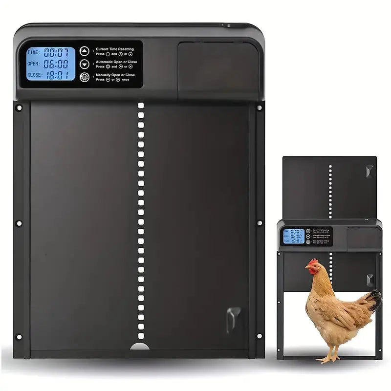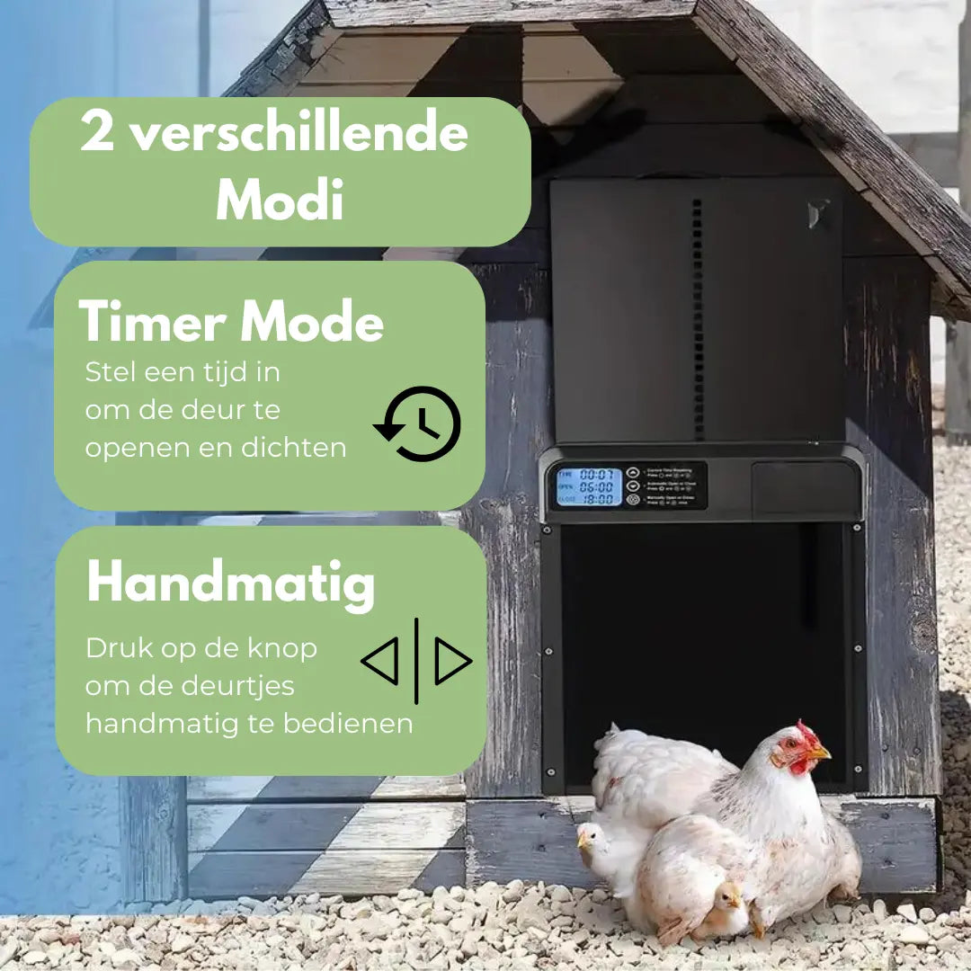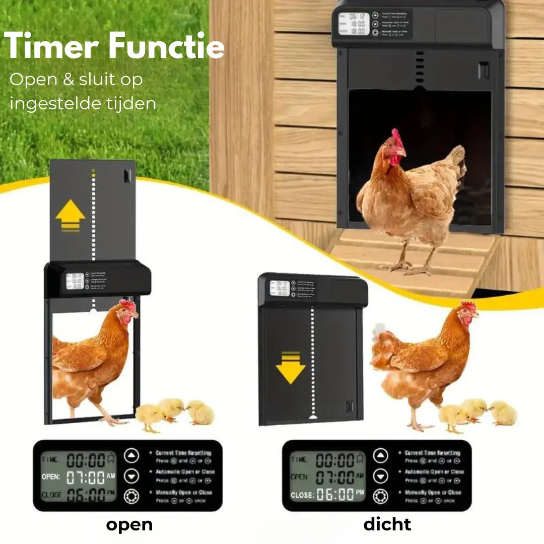 Een automatische oplossing voor het beheren van het kippenhok. Dit weerbestendige luik opent en sluit op een instelbare timer, zodat je kippen veilig binnen zitten in de nacht en automatisch naar buiten kunnen wanneer het veilig is – zonder handmatig werk.