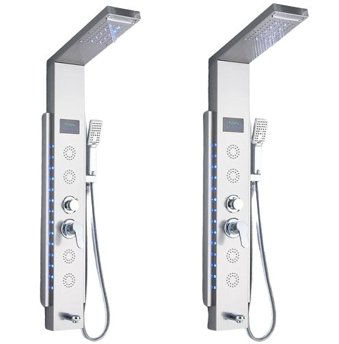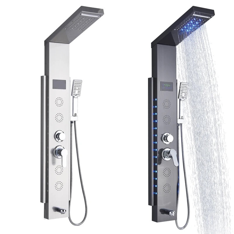 Complete luxe Premium Douchepaneel van VoordeelPaleis®. Type Marine LCD Premium zilver Brush. Douchepaneel met regendouche, 4 ronde jets, waterval, uitloopkraan, Dit douchepaneel model beschikt tevens over een kompleet LCD paneel dat werkt op waterdruk (dus geen stroom nodig !); hierop kan ondermeer de watertemperatuur en tijd van douchen worden afgelezen. Aan beide zijkanten zit led verlichting