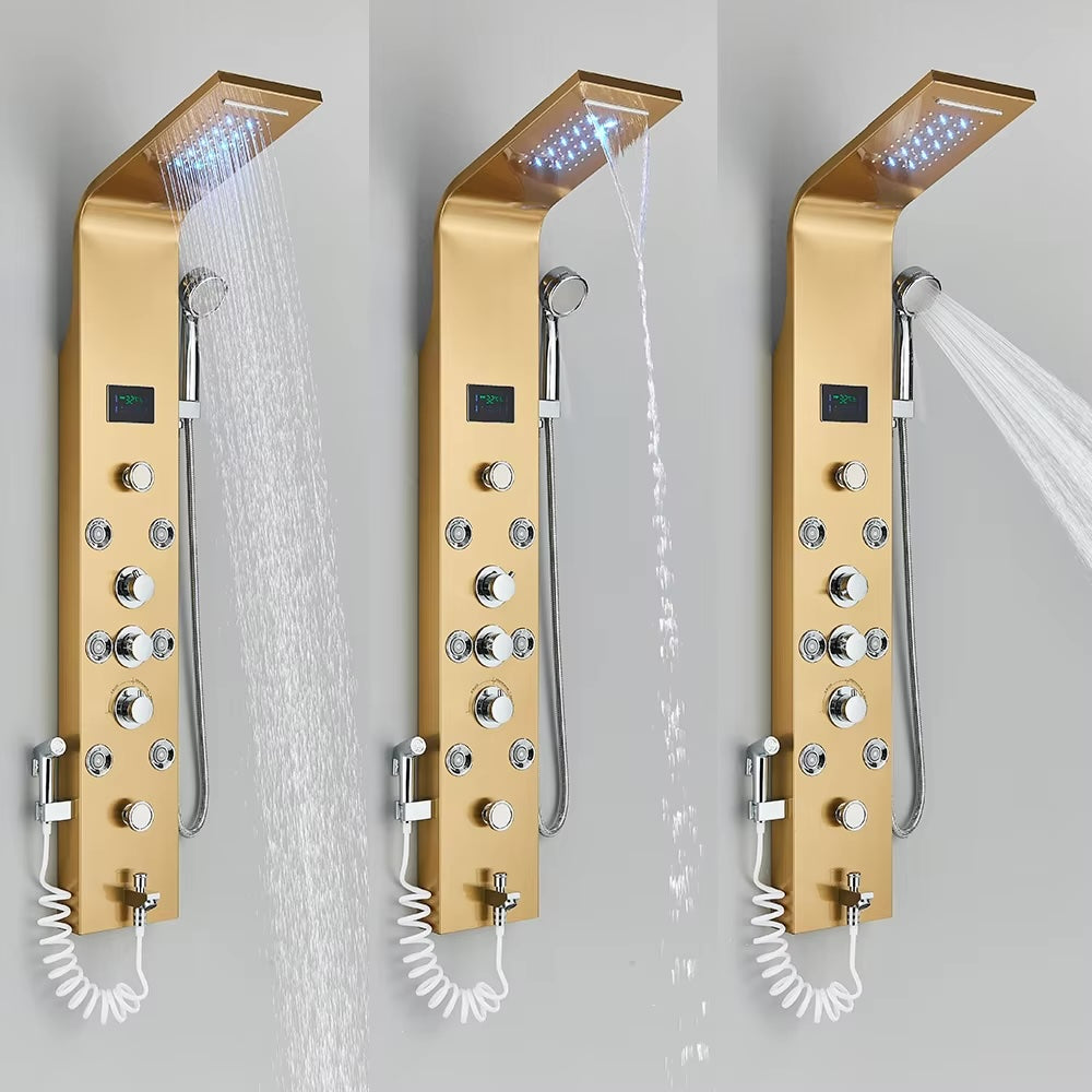 Komplete luxe Douchepaneel van VoordeelPaleis®. Type Mauve Premium Goud brushed. Douchepaneel met regendouche, 6 jets, waterval, uitloopkraan en handdouche. De unit heeft zelfs een kompleet LCD paneel dat werkt op waterdruk (dus geen stroom nodig !); hierop kan ondermeer de watertemperatuur en tijd van douchen worden afgelezen.