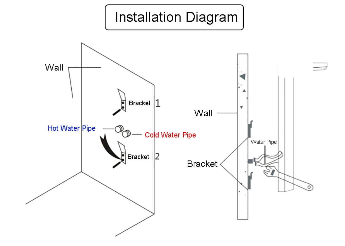 Het paneel wordt door middel van twee beugels aan de muur bevestigd en is voorzien van flexibele slangen welke op de waterleiding kunnen worden bevestigd. De installatie is dan ook zeer eenvoudig en is dan ook toepasbaar in vrijwel iedere situatie (vanwege de flexibele slangen maakt de bestaande hartafstand tussen warm en koud water niet uit).