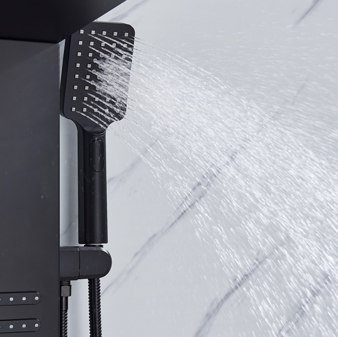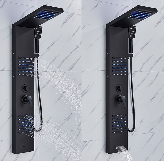 Kompleet luxe Douchepaneel van VoordeelPaleis®. Type Xena mat zwart. Douchepaneel met regendouche, groot massagepaneel mini-jets, waterval, uitloopkraan en handdouche. De unit heeft zelfs verlichting in de jets door middel van een batterij die eenvoudig te plaatsen en te vervangen is.