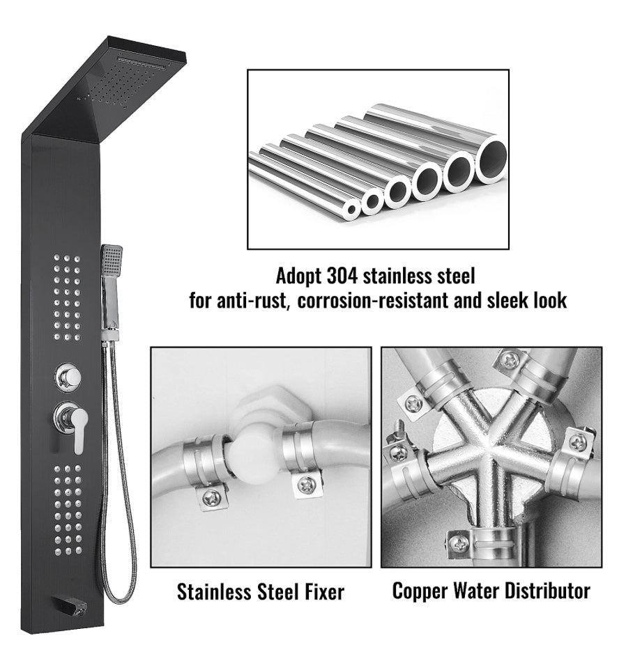 Dit douchepaneelsysteem bestaat uit een frame van roestvrij staal 304, een waterverdeler van messing en een bevestiging van roestvrij staal en is onderhoudsvrij, roest-/corrosiebestendig en verlengt de levensduur.