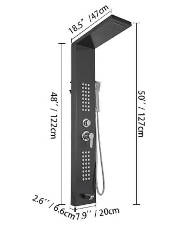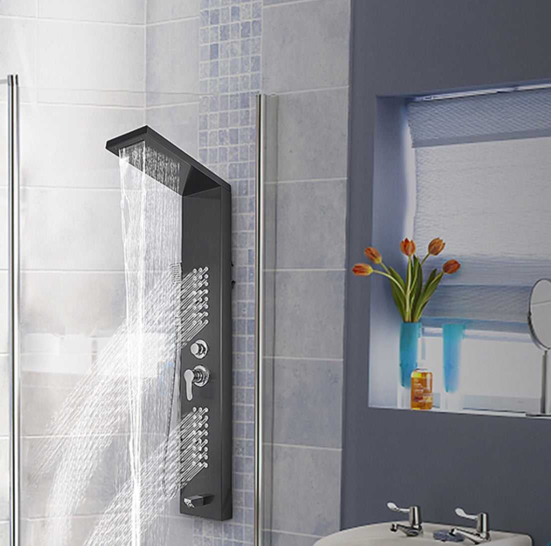 Compleet luxe Douchepaneel van VoordeelPaleis®. Type Tanzania zwart. Douchepaneel met regendouche, groot massagepaneel mini-jets, waterval, uitloopkraan en handdouche.