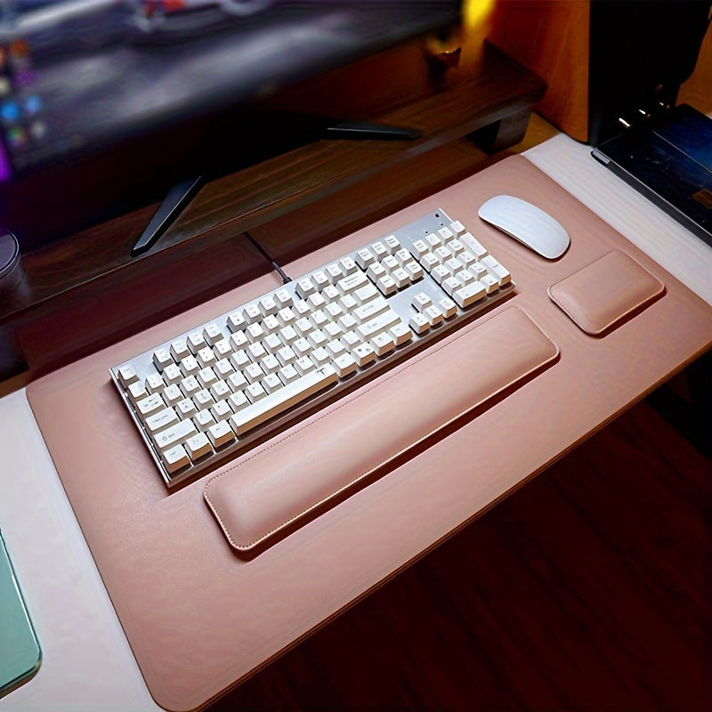 Creëer in één keer een opgeruimde en comfortabele werkplek met deze complete bureauset. De set bestaat uit een grote bureau-onderlegger die je werkoppervlak beschermt, en twee ergonomische polssteunen voor zowel je muis als toetsenbord. Dankzij het duurzame PU-leer en de zachte schuimvulling werk je de hele dag door comfortabel. De antislip onderzijde voorkomt verschuiven en zorgt voor stabiliteit, of je nu thuis werkt, studeert of op kantoor bent.
