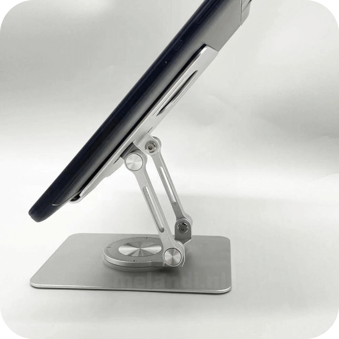 Onze tabletstandaard is voorzien van een groot 360 ° roteerbaar chassis, waardoor u uw tablet, laptop of telefoon naar elke gewenste hoek kunt draaien. De twee assen verbonden met de basis bieden optimale flexibiliteit.