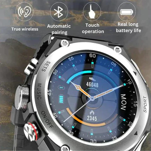 HealthGuard™ gaat verder dan een gewone smartwatch en markeert een revolutie in welzijnsbeheer. Wat het echt apart maakt, is het ingebouwde oplaadsysteem voor oordopjes, zodat je nooit meer je oortjes kwijtraakt.