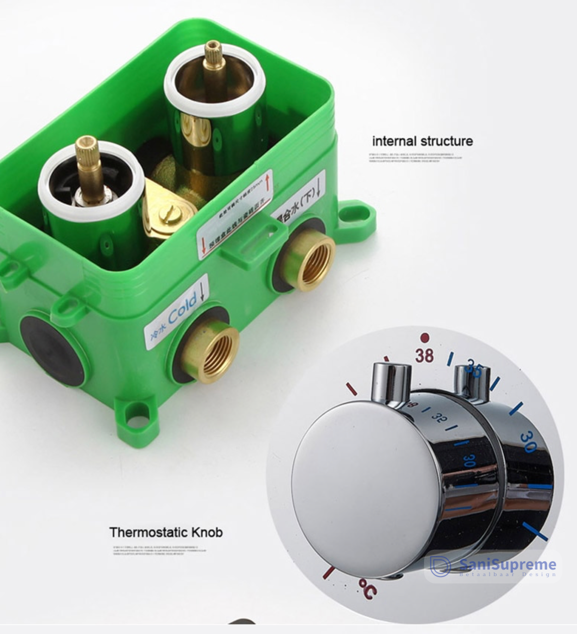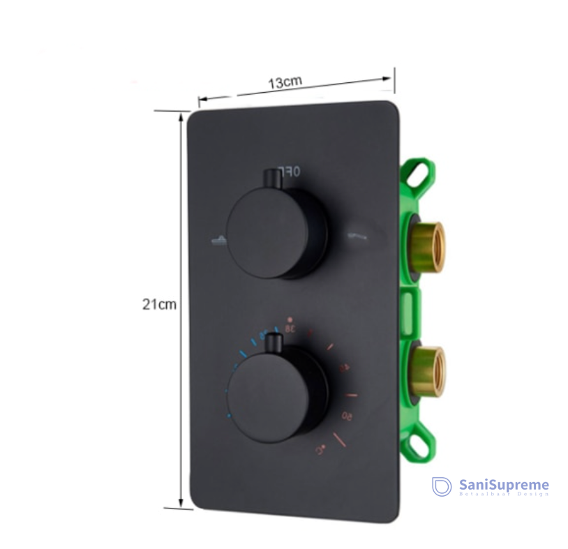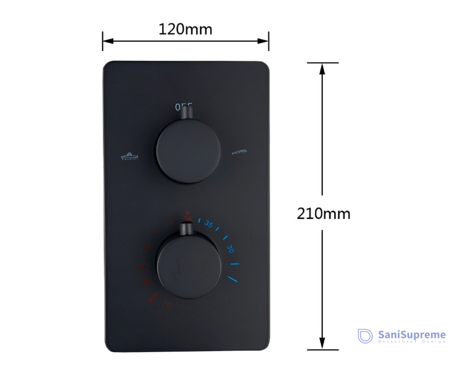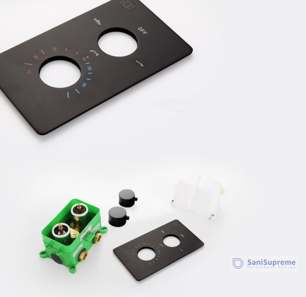 Professionele kwaliteitsmengkraan inbouw mat zwart uit de SaniSupreme serie Manhattan. Deze inbouw mengkraan is geschikt voor inbouw douchecombinaties met een 2-weg systeem (regendouche, kraan en handdouche). Deze is ook verkrijgbaar als 3-wegsysteem. Dit is de Premium versie met een mengkraan en afdekplaat met bediening handels/knoppen. De plaat is extra dik uitgevoerd (0.3 mm) en dus extra stevig en robuust.