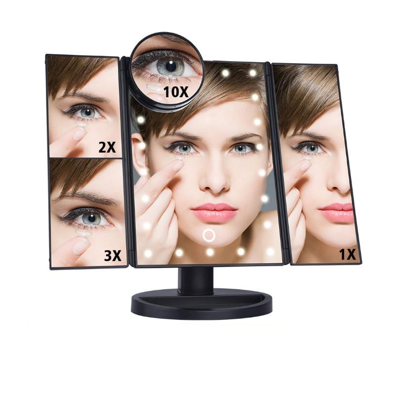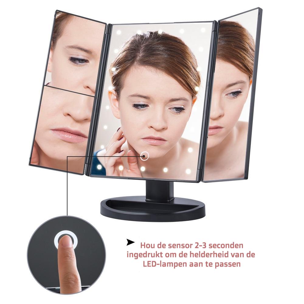 Met deze make-up spiegel kan de dagelijkse gezichtsverzorging thuis net zo professioneel worden uitgevoerd als bij de schoonheidsspecialist! De 3-luik spiegels hebben een 1-, 2-, 3-, en 10-voudige vergroting! Verder is de spiegel voorzien van maar liefst 24 LED lampjes waardoor je perfect zicht hebt tijdens het opmaken en zodoende alle oneffenheden weg kunt werken.