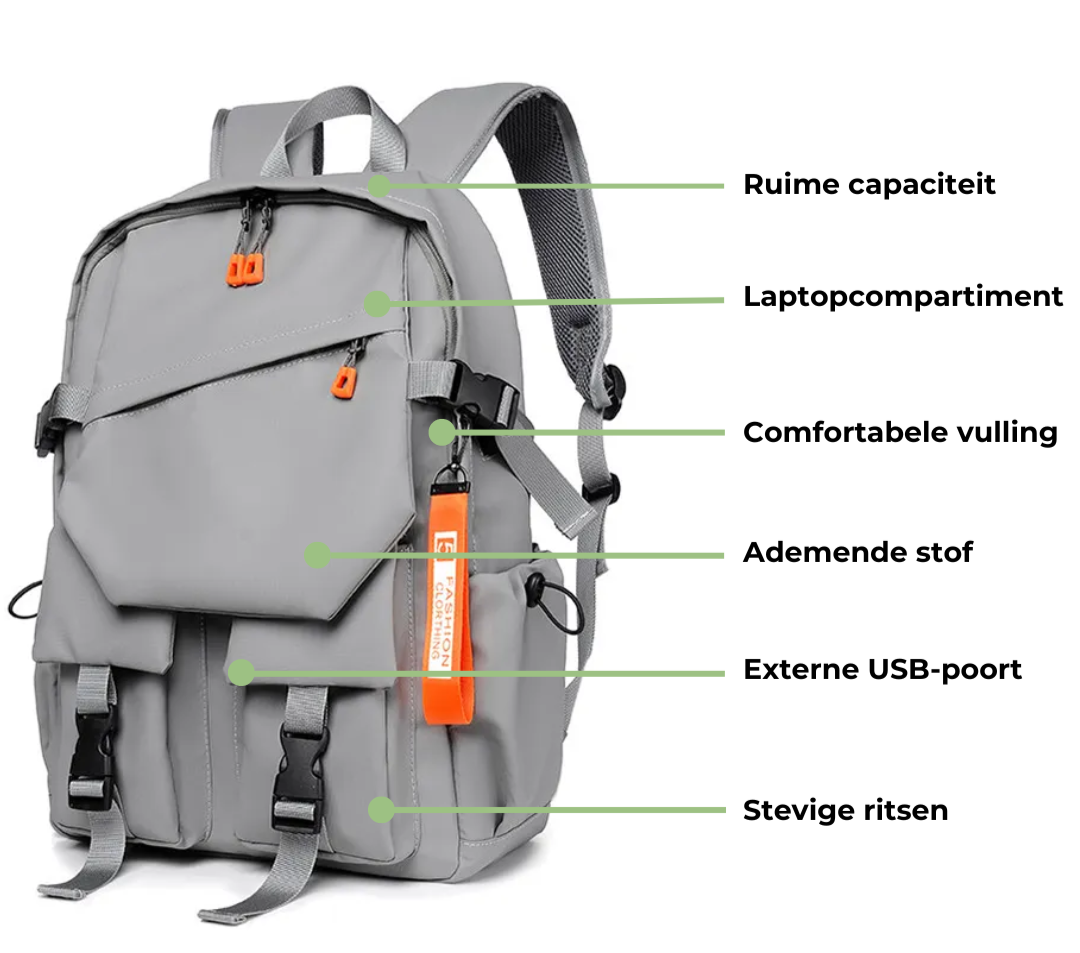 Extra Functies: Inclusief een verborgen anti-diefstalvak en een USB-oplaadpoort voor handig opladen van apparaten onderweg.