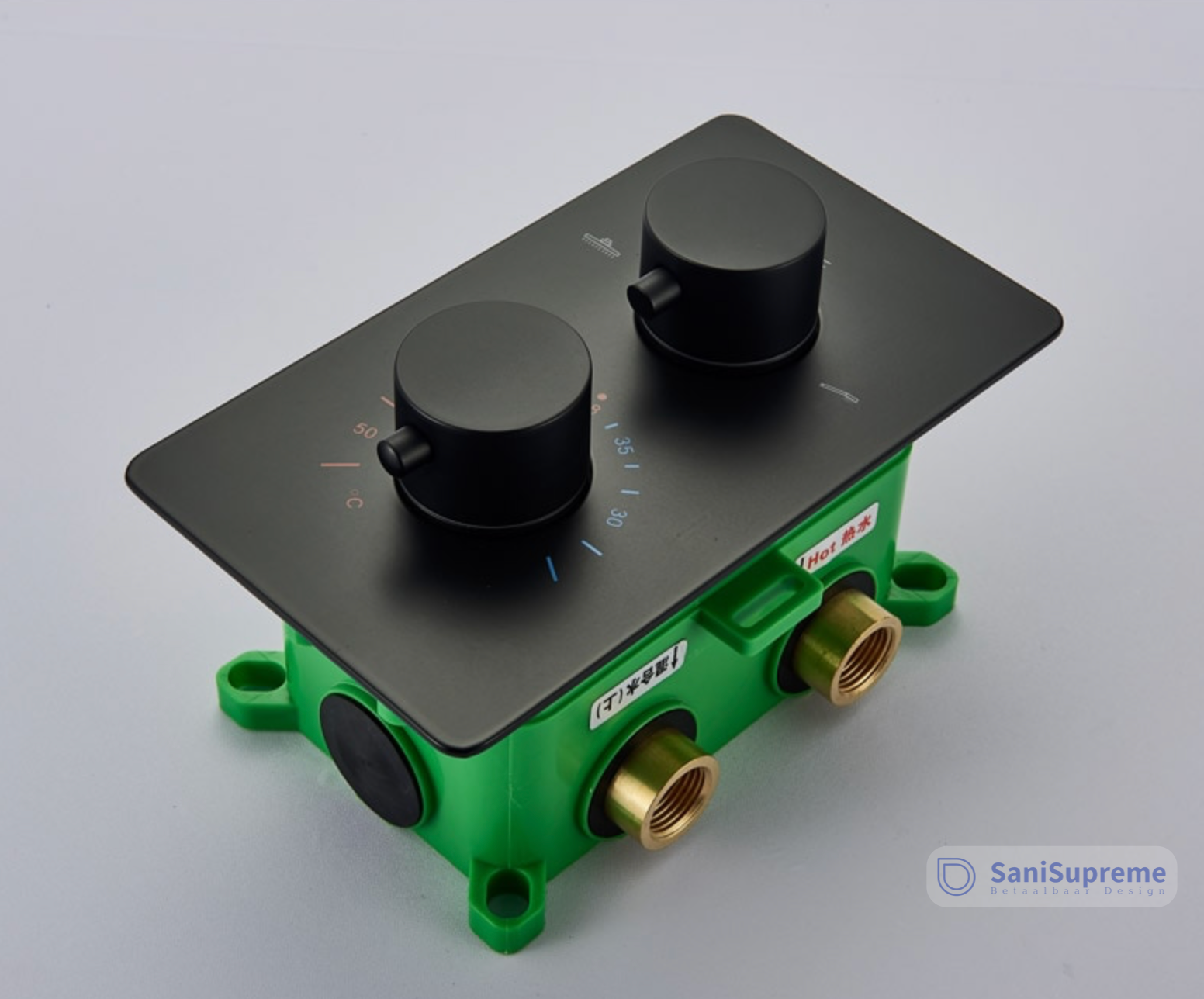 Deze kwalitatief hoogwaardige inbouwset heeft een inbouwunit met regelaar voor 2 uitgangen; de rechthoekige sierplaat van de mengunit is maar liefst 5 mm. dik messing en dus zware kwaliteit evenals de bedieningsknoppen.