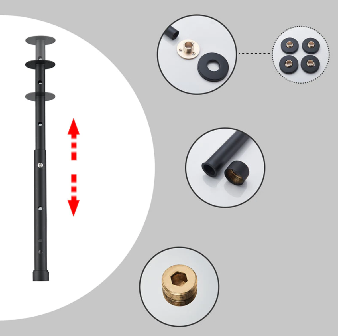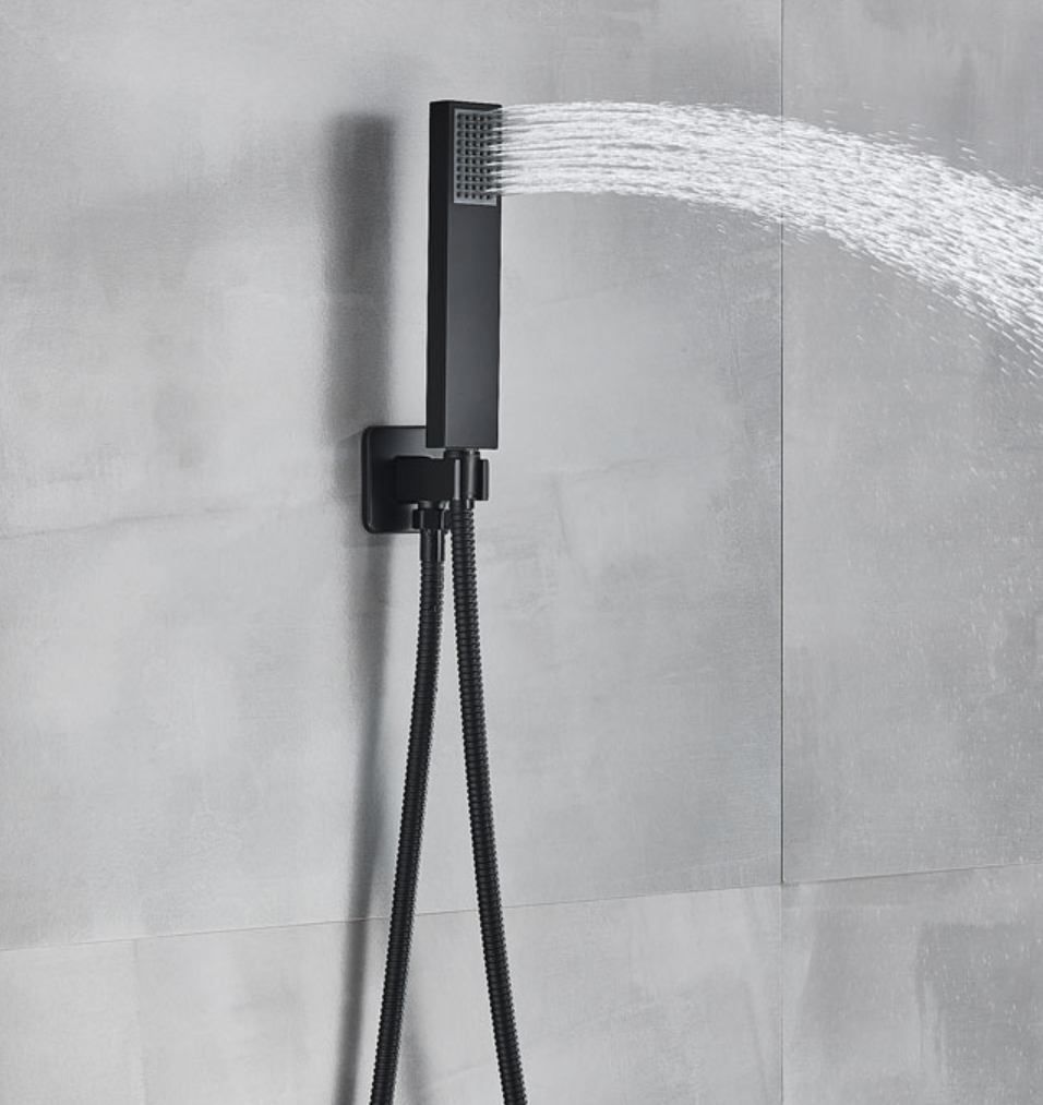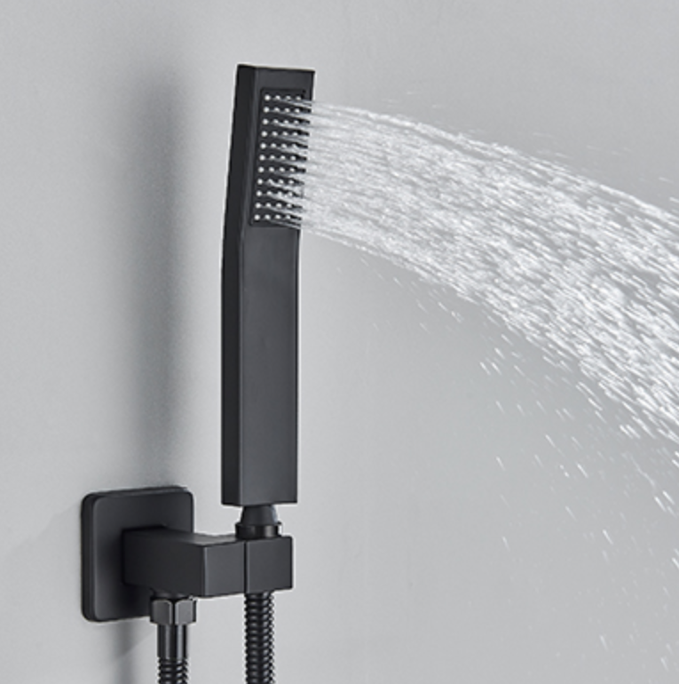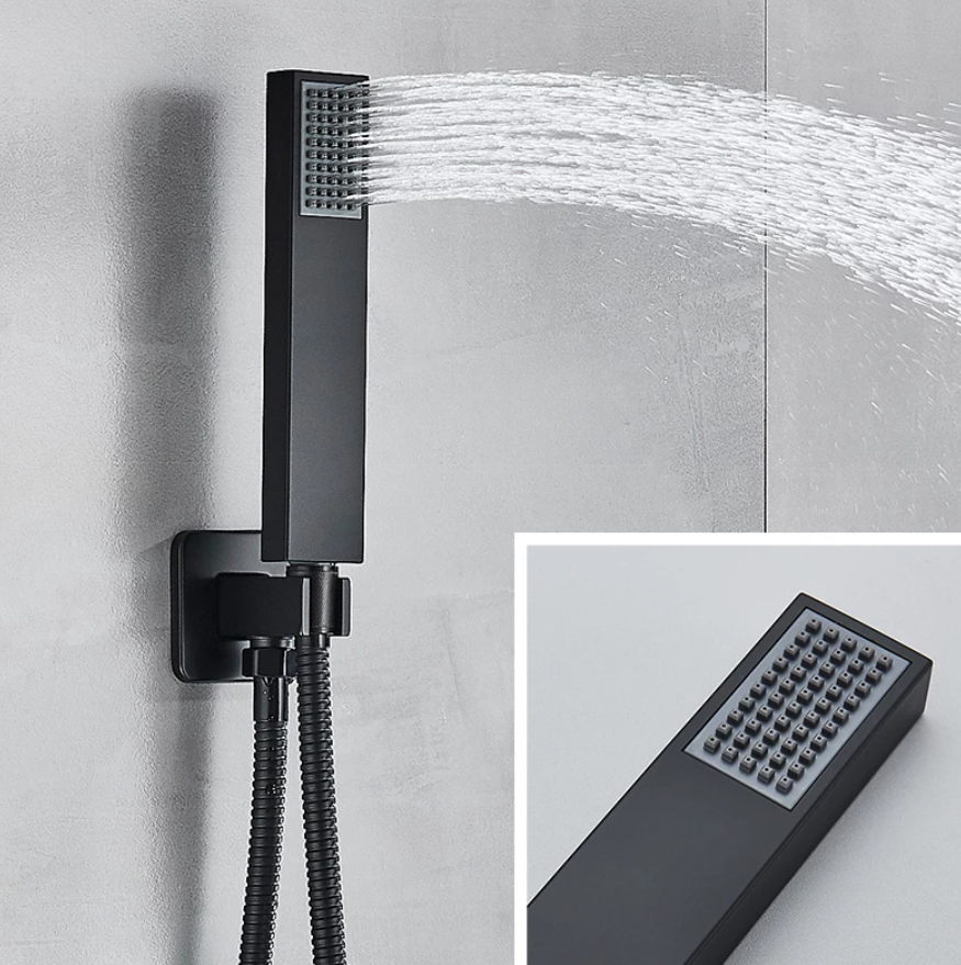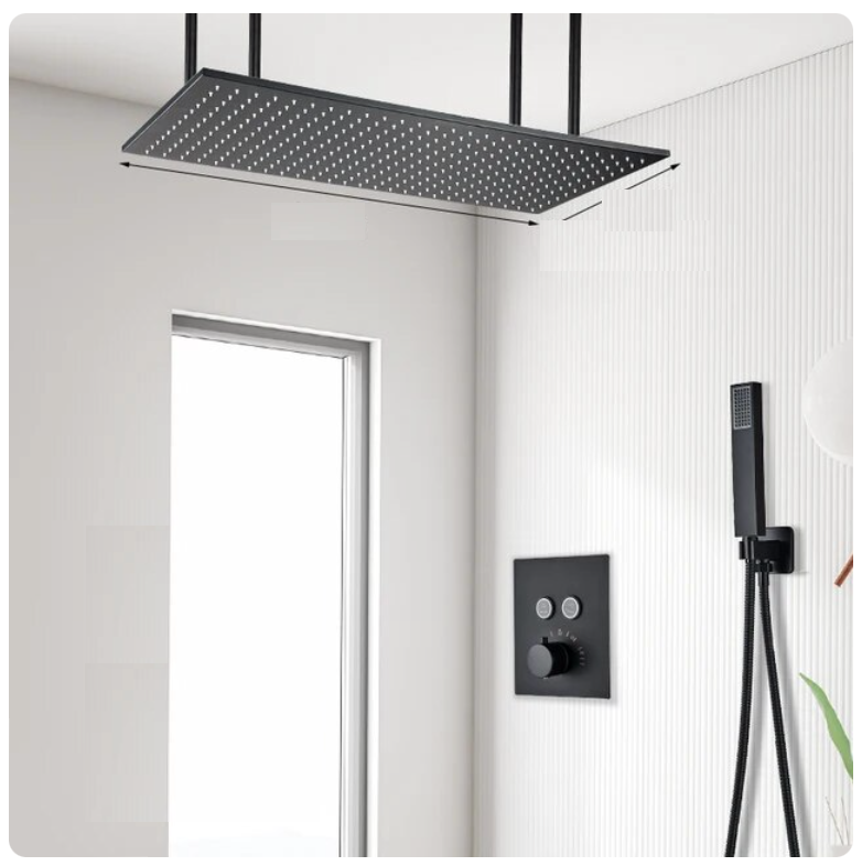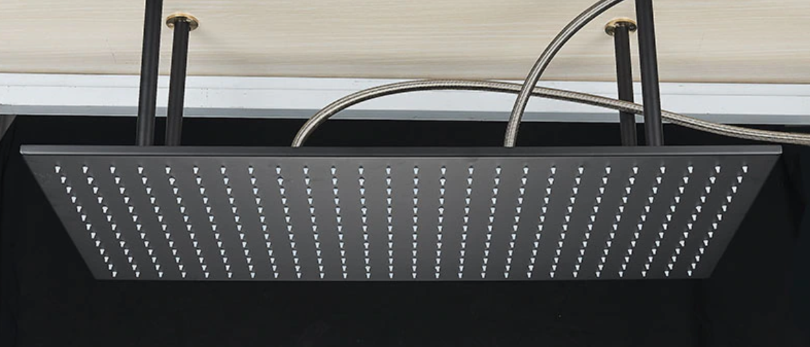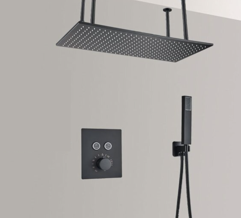 alle inbouw onderdelen zijn van degelijk kwalitatief hoogwaardig staal en zelfs de draai knoppen zijn hiervan gemaakt. De set is afgewerkt in een mooi mat zwarte finish. Een kleinere douchekop is uiteraard mogelijk (16, 12, 10 of 8 inch)