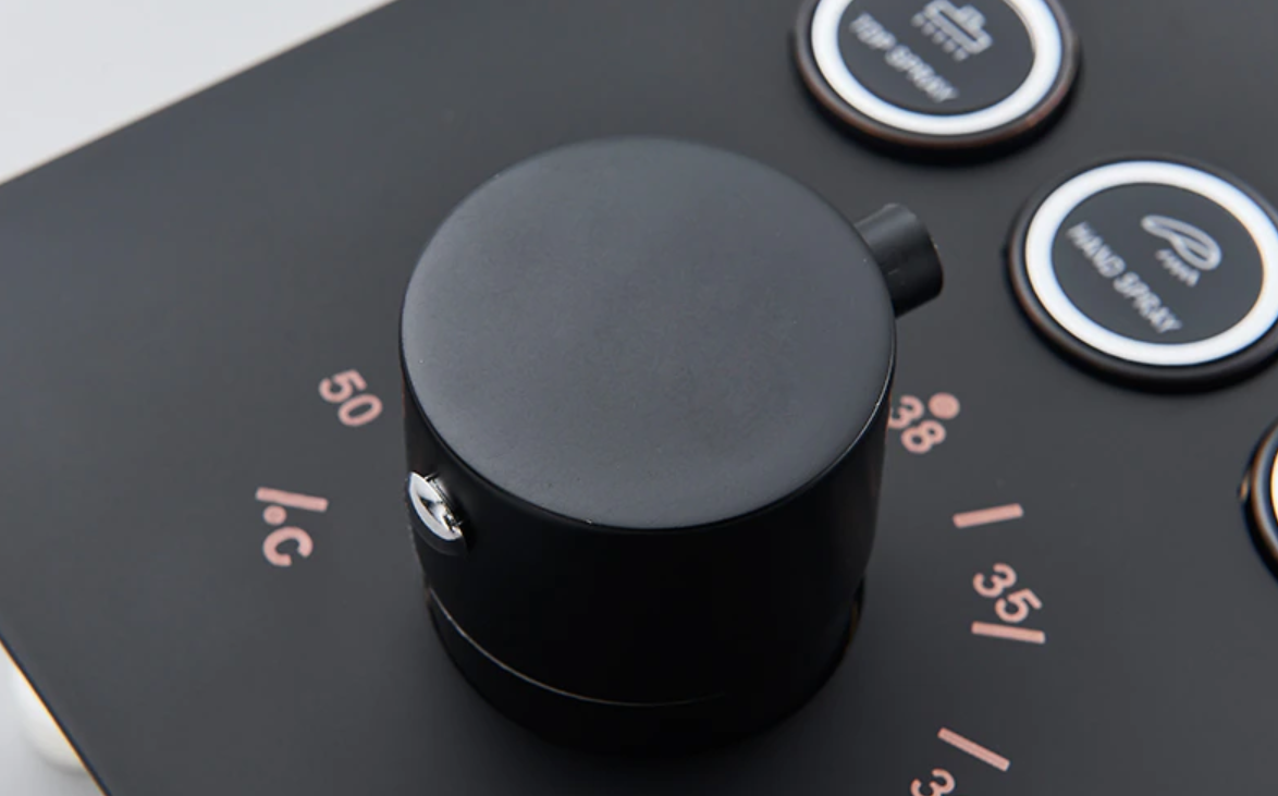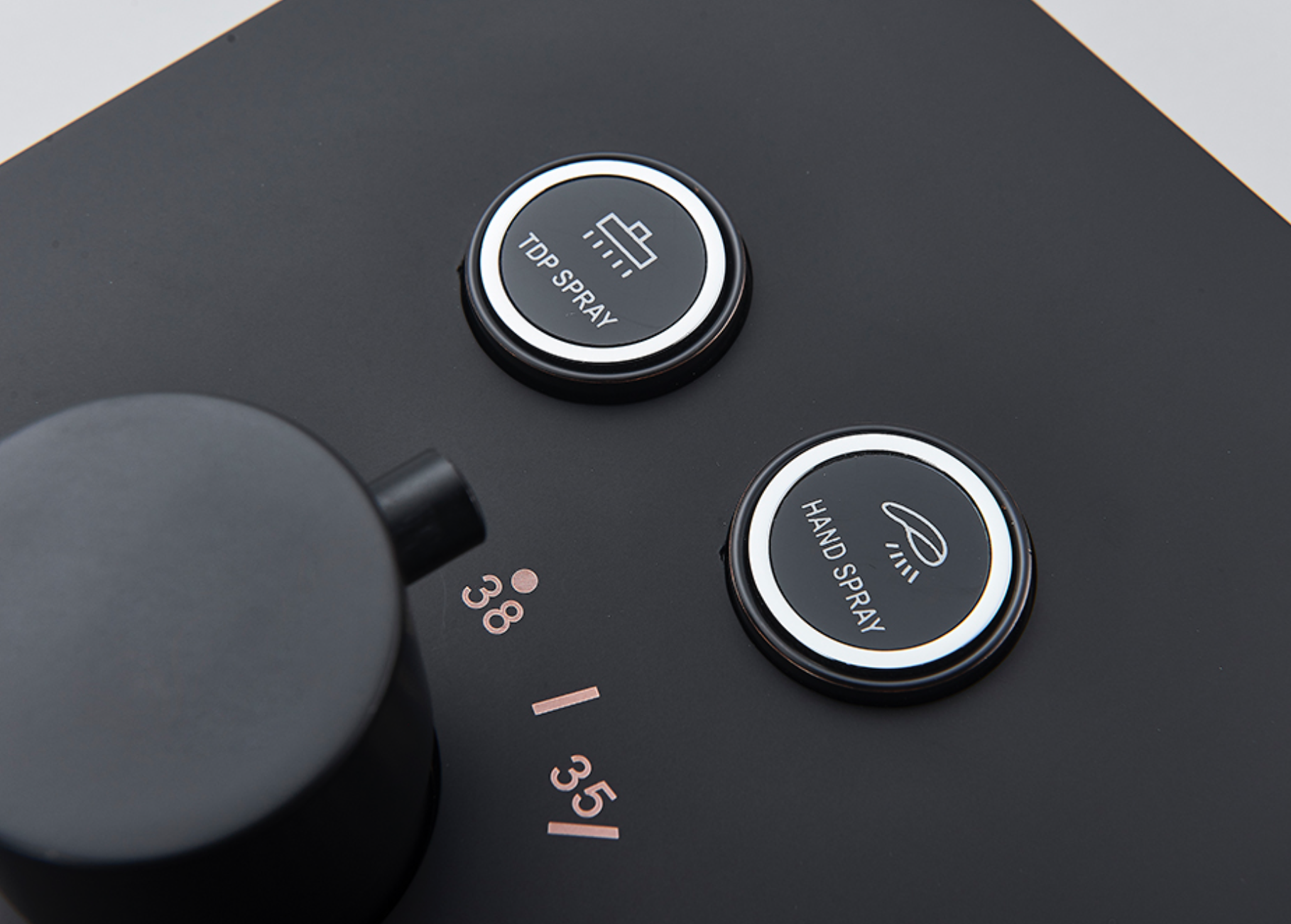 Deze kwalitatief hoogwaardige inbouwset heeft een thermostatische inbouwunit-mengkraan met regelaar voor 2 uitgangen; 2 moderne touch-knoppen voor bediening van douche, kraan of handdouche.