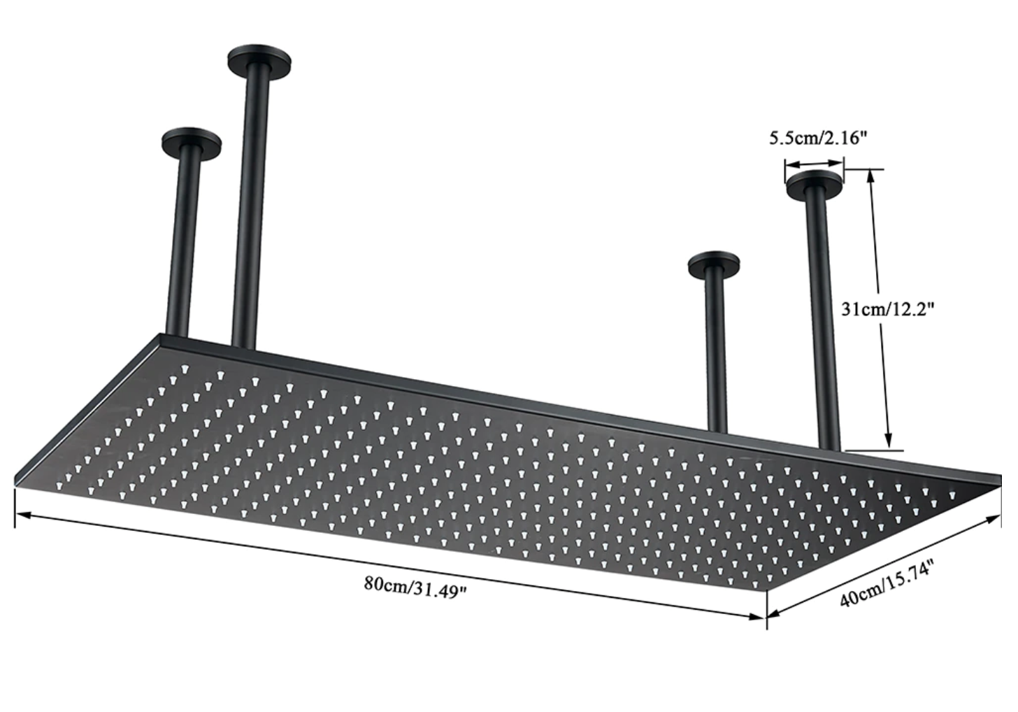 Douchen als een prins onder de 40x80 cm. grote Regendouche Plafond. Veel luxer kan het haast niet of je moet in de regen buiten staan. Komplete inbouw design doucheset van het betrouwbare merk SaniSupreme. Dit is een versie die aan of in het plafond bevestigd kan worden. Uitgevoerd in RVS en messing en is vergelijkbaar met de horizontale inbouwdouche Manhattan. De bedieningsknoppen zijn van RVS en dus niet van plastic zoals vele andere modellen en merken wel aanbieden. De set wordt standaard geleverd met de ultra platte douche-plateau.
