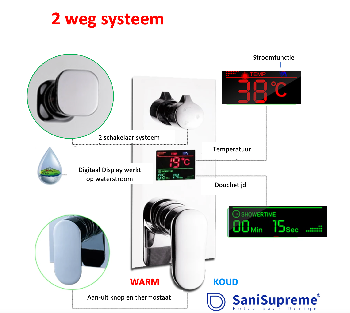 De meest komplete en luxe SaniSupreme® inbouw doucheset beschikbaar. Inclusief thermostatische mengkraan unit met LCD scherm ! Informatie over de temperatuur, tijdsklok/timer en nog veel meer informatie. Het LCD scherm werkt op waterstroom (hydro-generator) en heeft dus geen electra-aansluiting nodig en is daardoor 100% veilig. Maar liefst 2 schakel-koppelingen voor de regendouche en handdouche.