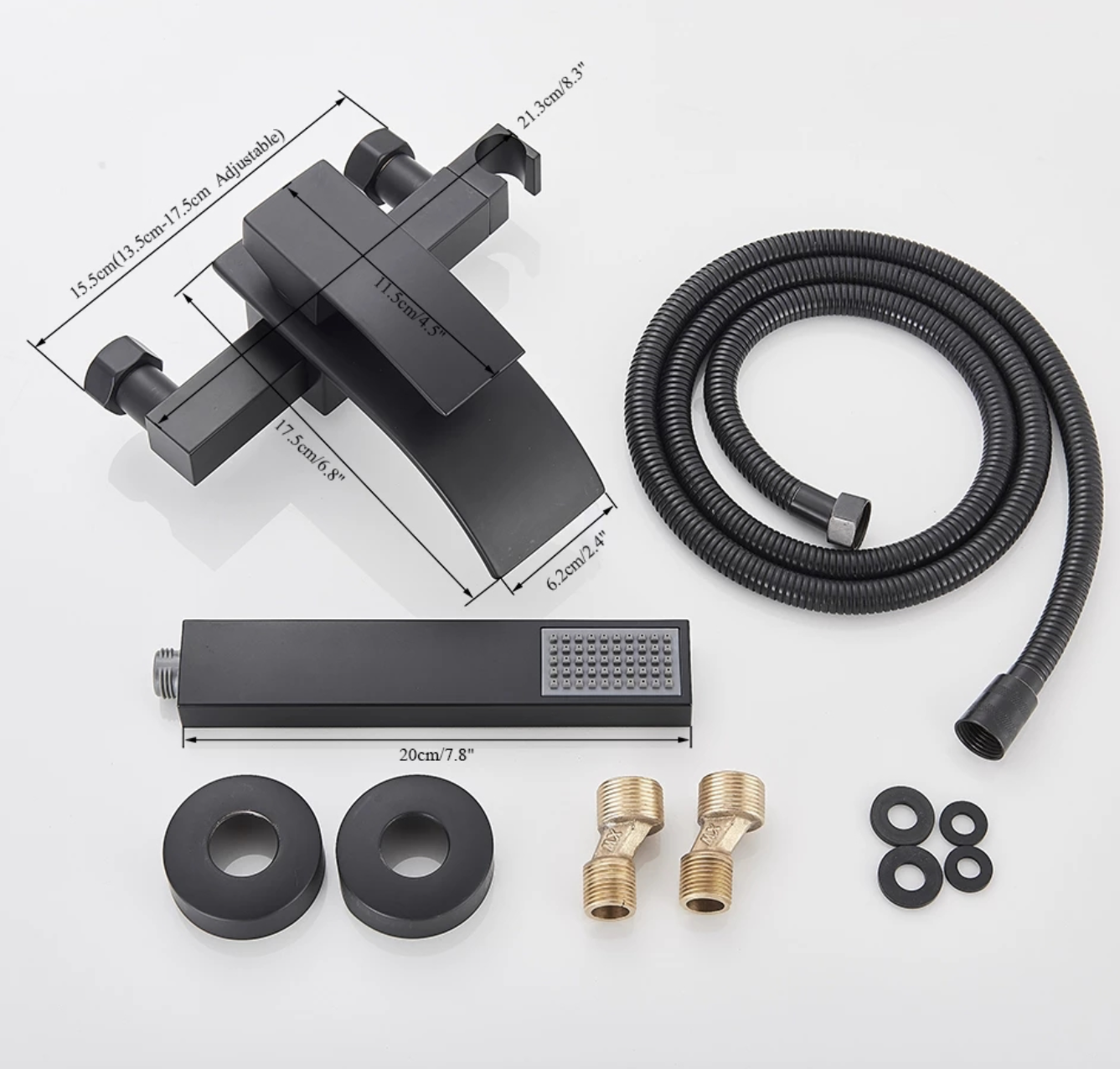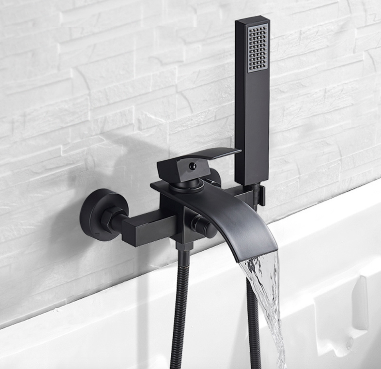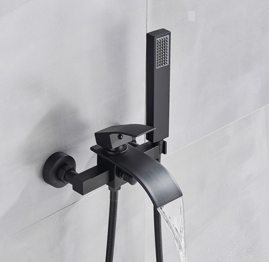 Komplete design SaniSupreme Luca Doucheset / Badset met kwaliteit mengkraan met baduitloop en handdouche met 3 standen en zwarte RVS doucheslang. Zeer komplete mooie strakke designset voor een super combinatieprijs.