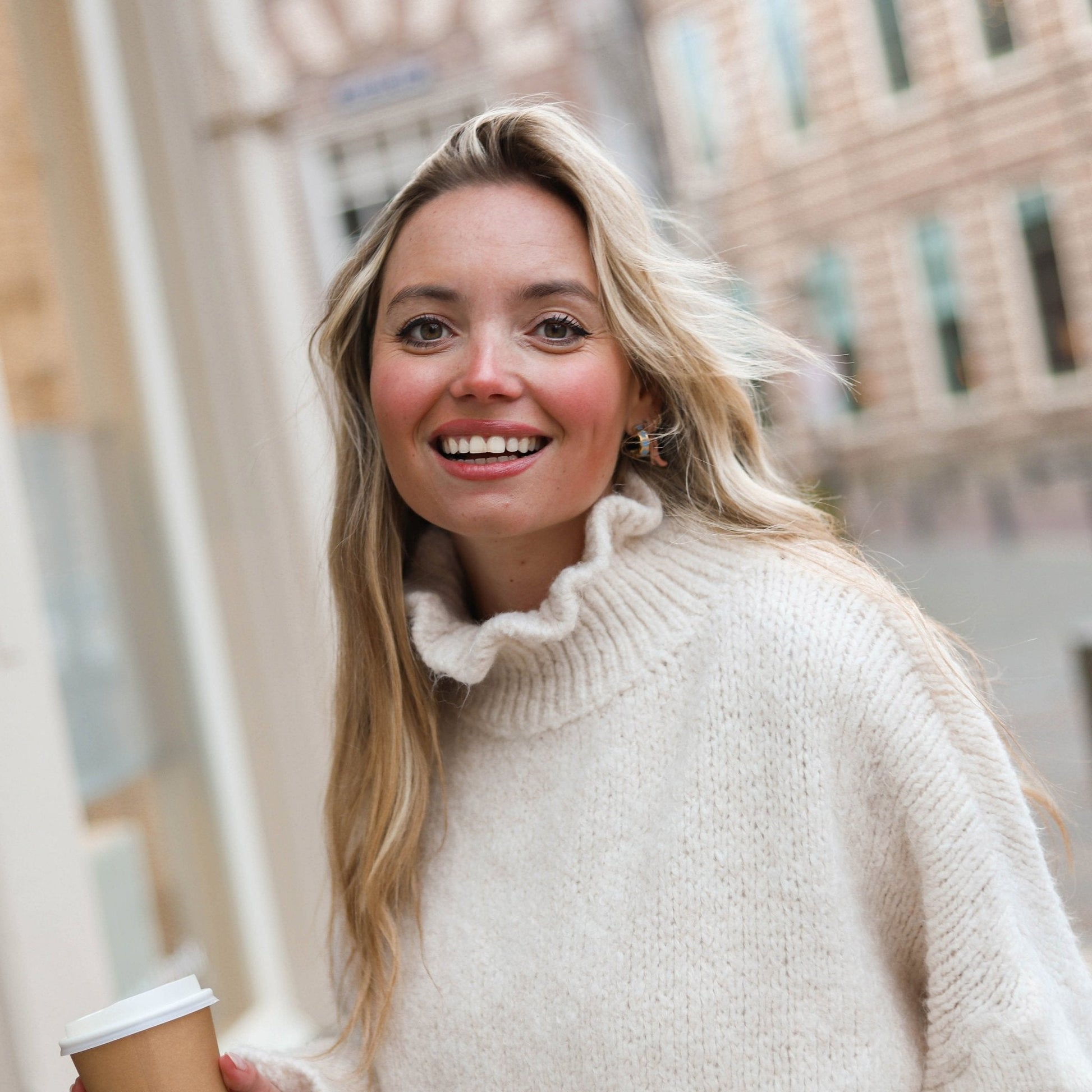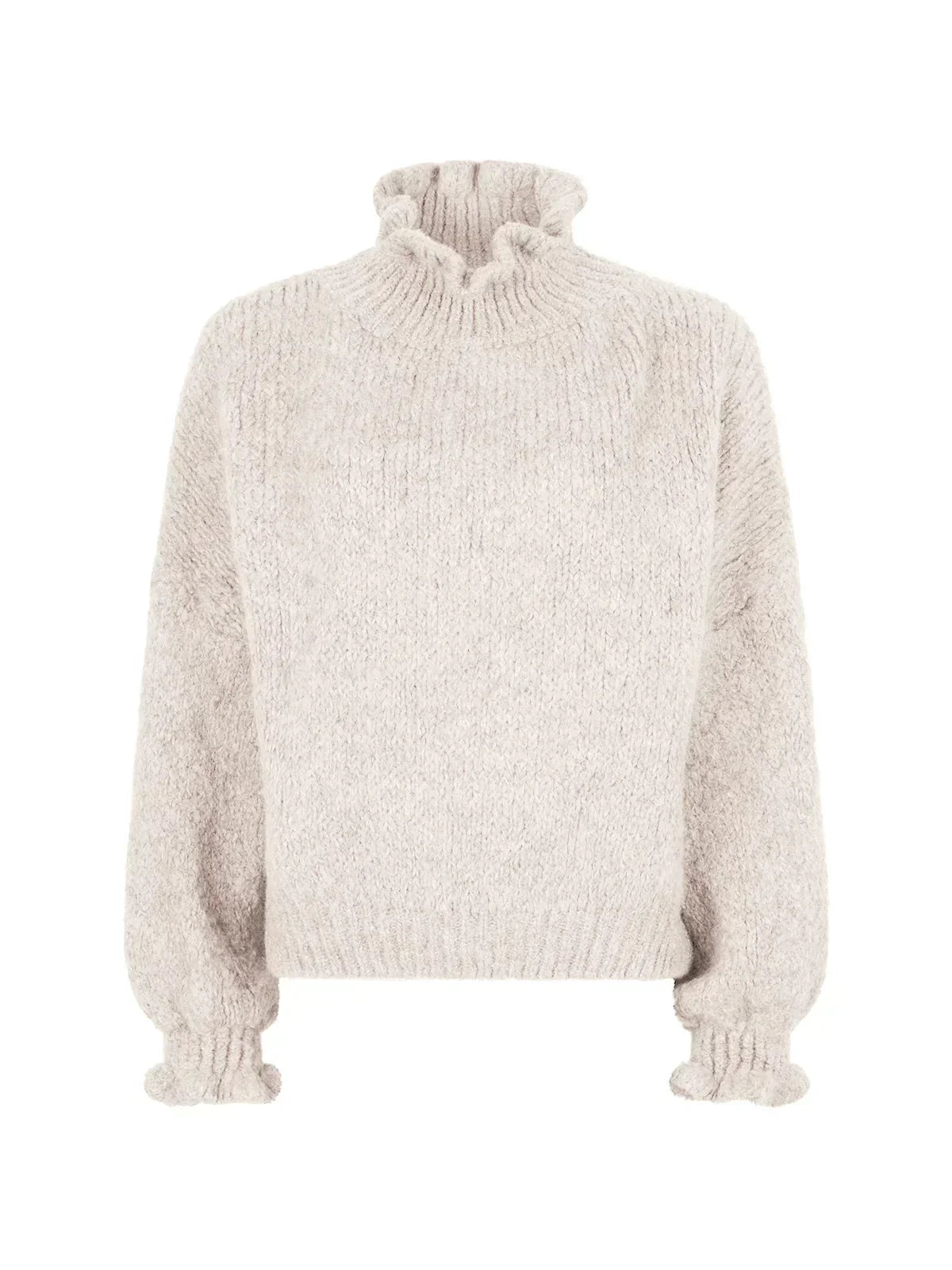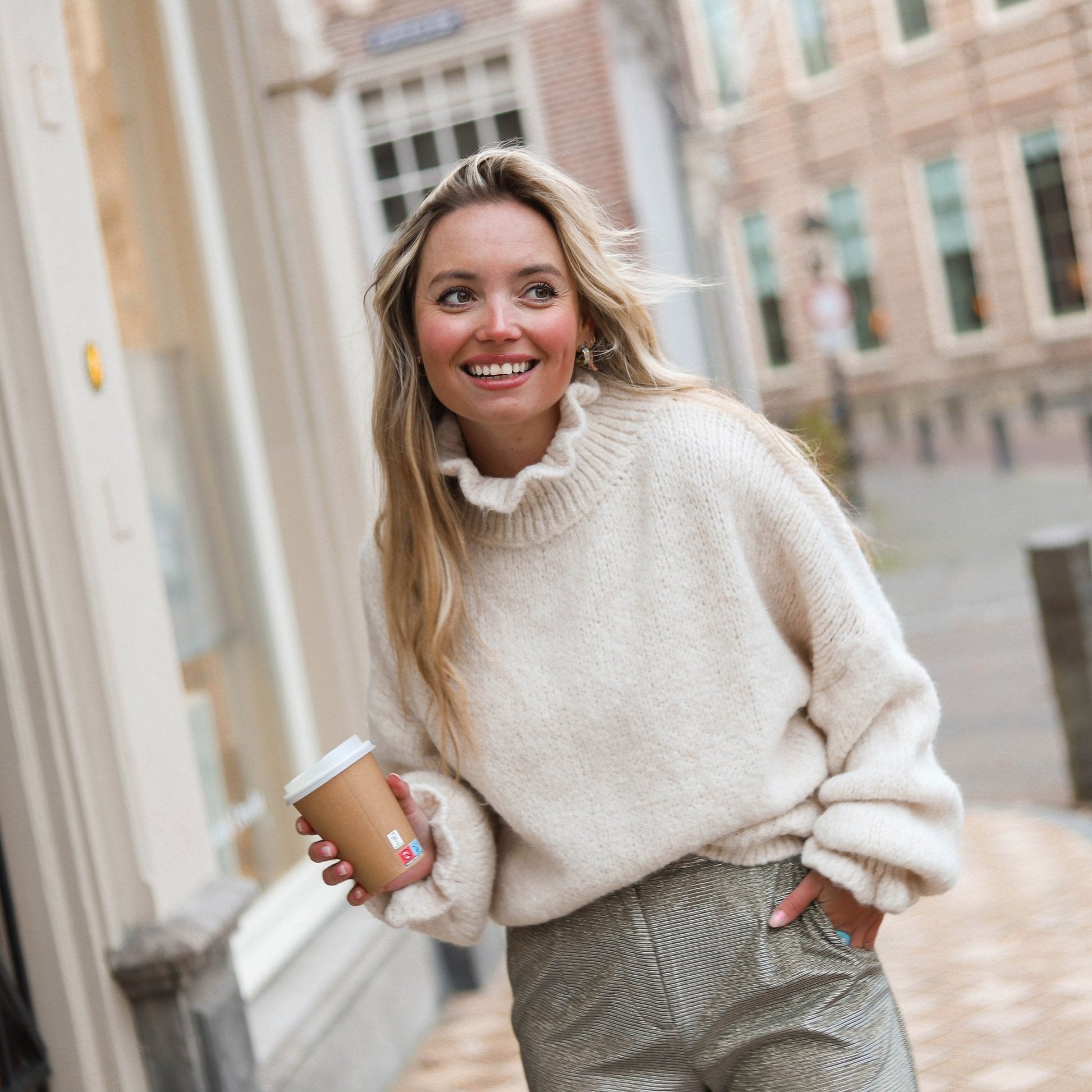 Mooie ecru trui met een ruffle kraag. De trui heeft ook ruffles aan de onderkant van de mouwen. De trui zit heerlijk en is super warm. Combineer met een legging of jeans. Maak het af met een gilet.