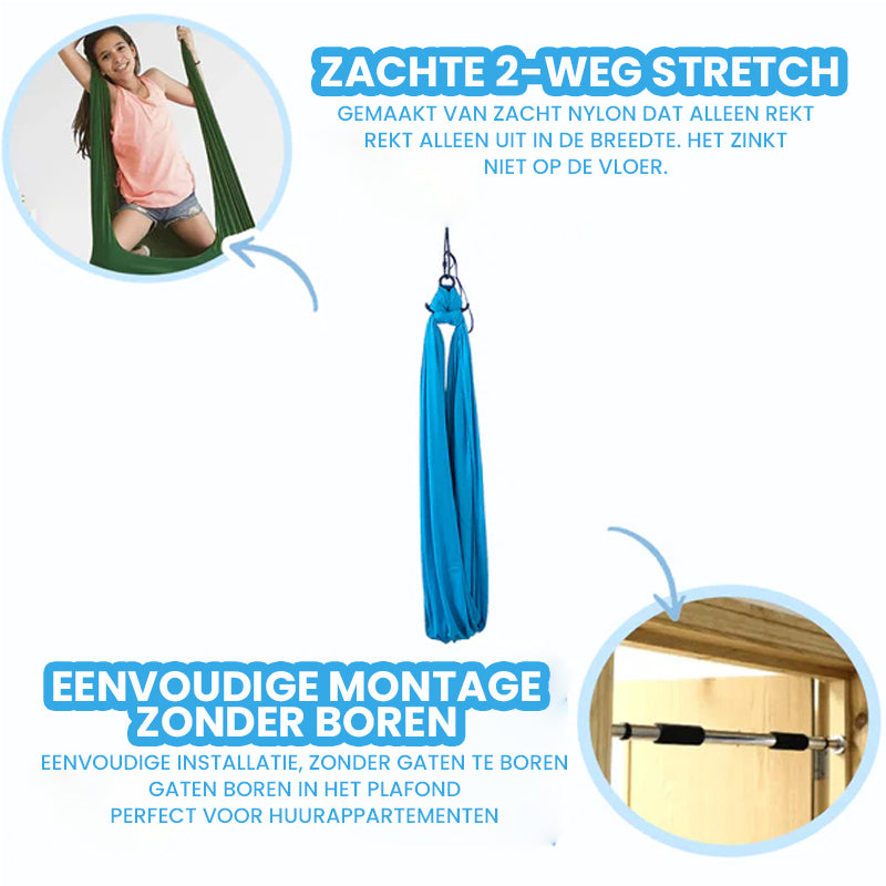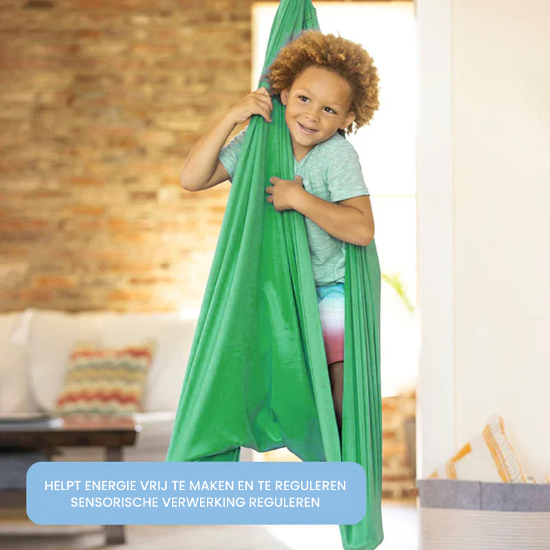 Een veelzijdige schommel die ontspanning en zintuiglijke ontwikkeling bevordert, geschikt voor binnen en buiten.