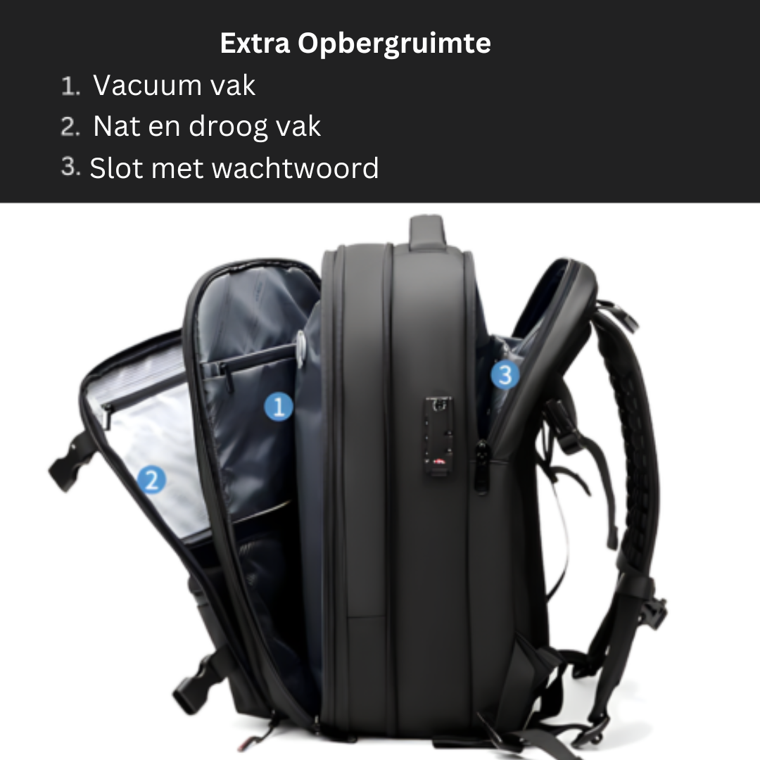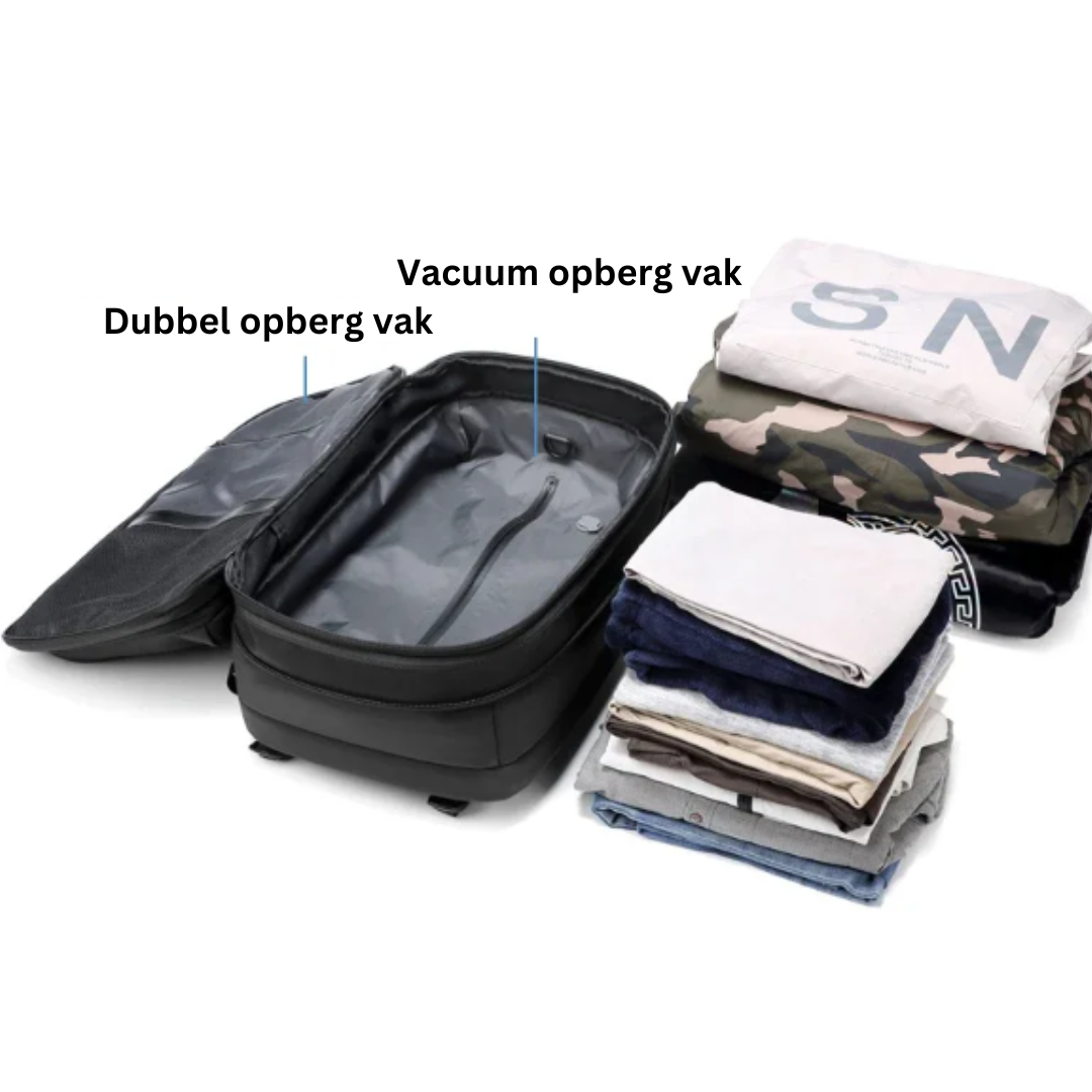 De TravelMate™ is ontworpen om je reiservaringen te transformeren. Met zijn geïntegreerde vacuümcompressiesysteem kun je tot 50% meer items inpakken dan met een gewone rugzak.