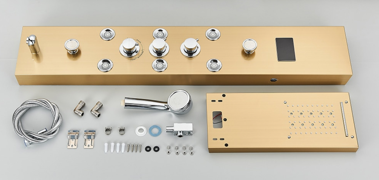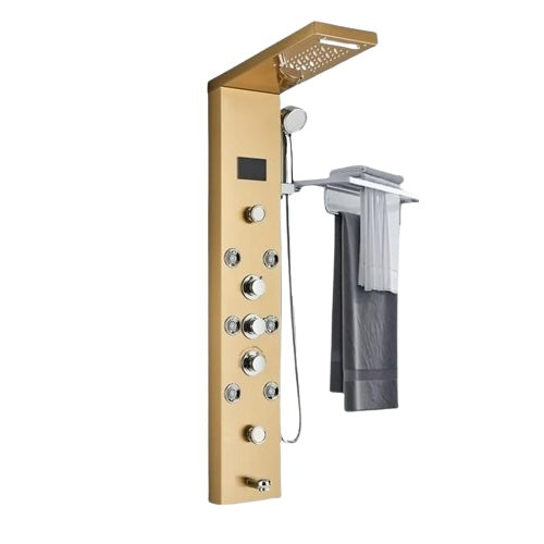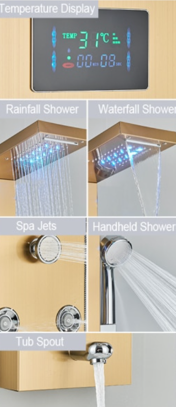 Complete luxe Douchepaneel van VoordeelPaleis®. Type Santos Premium goud. Douchepaneel met regendouche, 6 jets, waterval, uitloopkraan en handdouche. De unit heeft zelfs een compleet LCD paneel dat werkt op waterdruk (dus geen stroom nodig !); hierop kan onder meer de watertemperatuur en tijd van douchen worden afgelezen.