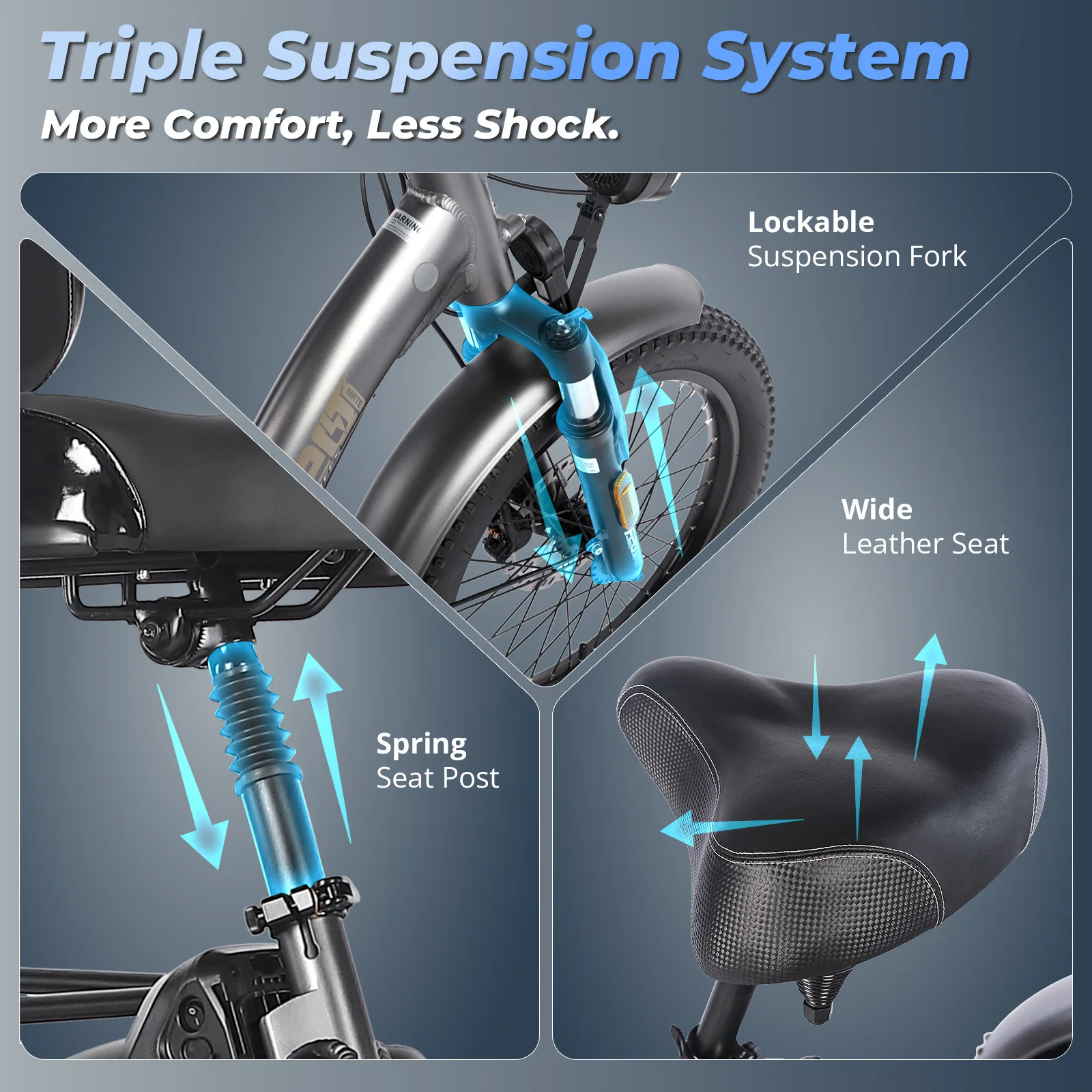Driedubbele Vering Voorvorkvering (vergrendelbaar), geveerde zadelpen én een breed leren zadel vangen schokken op en zorgen voor comfortabele ritten, zelfs op oneffen wegen.